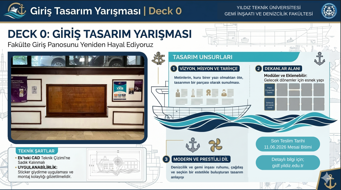 Gemi İnşaatı ve Denizcilik Fakültesi binasına adım atan her öğrenciyi, akademisyeni ve ziyaretçiyi karşılayacak olan ana giriş panomuzu yeniden hayal ediyoruz. Deck 0, fakültemizin vizyonunu, tarihini ve denizcilik tutkusunu yansıtacak bir tasarıma dönüşüyor!